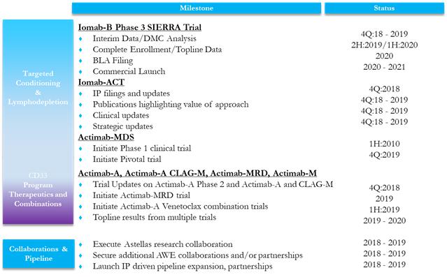 ♦ Targeted conditioning program expanded to 3 trials including Iomab-ACT for CAR-T and near pivotal Actimab-MDS ♦ SIERRA trial reached 25% enrollment with interim data to be presented in oral presentation at ASH ♦ CD33 program expanded to best in class with the largest addressable patient population and breadth of applications ♦ AWE platform validation via our collaboration with Astellas and expanded research efforts