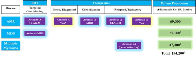 We focus on targeted conditioning because it enables treatments that are potentially curative in nature, such as BMT and CAR-T, for a significant number of patients with a range of diseases. In advance of BMT or CAR-T, patients must have their bone marrow and immune system conditioned to make room for the new cells. This is done today with non-targeted chemotherapy and external beam radiation. Our targeted conditioning approach delivers potent radiation to specific cells to enable more effective conditioning while at the same time minimizing effects to normal cells with the hopes of having the strongest and healthiest patient prior to their BMT or CAR-T. Our focus on targeted conditioning sets us apart as we believe we are the only company with a multi-disease, multi-target, late-stage pipeline for targeted conditioning. Further, we are not aware of any other company with a focus on targeted conditioning that is as advanced as we are in clinical trials. Our antigen targets CD45 and CD33 are widely expressed in many hematologic indications. We believe there is an opportunity to expand the addressable patient population for our programs. For example, CD45 is expressed on leukemia cells, lymphoma cells and multiple myeloma cells and significant data has been generated in these indications at the Fred Hutchinson Cancer Research Center which we can use for label expansion of Iomab-B. With CD33 we are targeting high-risk MDS patients with the Actimab-MDS program. Because the addressable market for our targeted conditioning drug candidates is limited to 50-100 medical centers that perform a majority of BMT and CAR-T procedures, we believe we have a tremendous opportunity to create a leading, independent organization in this space that has little competition.