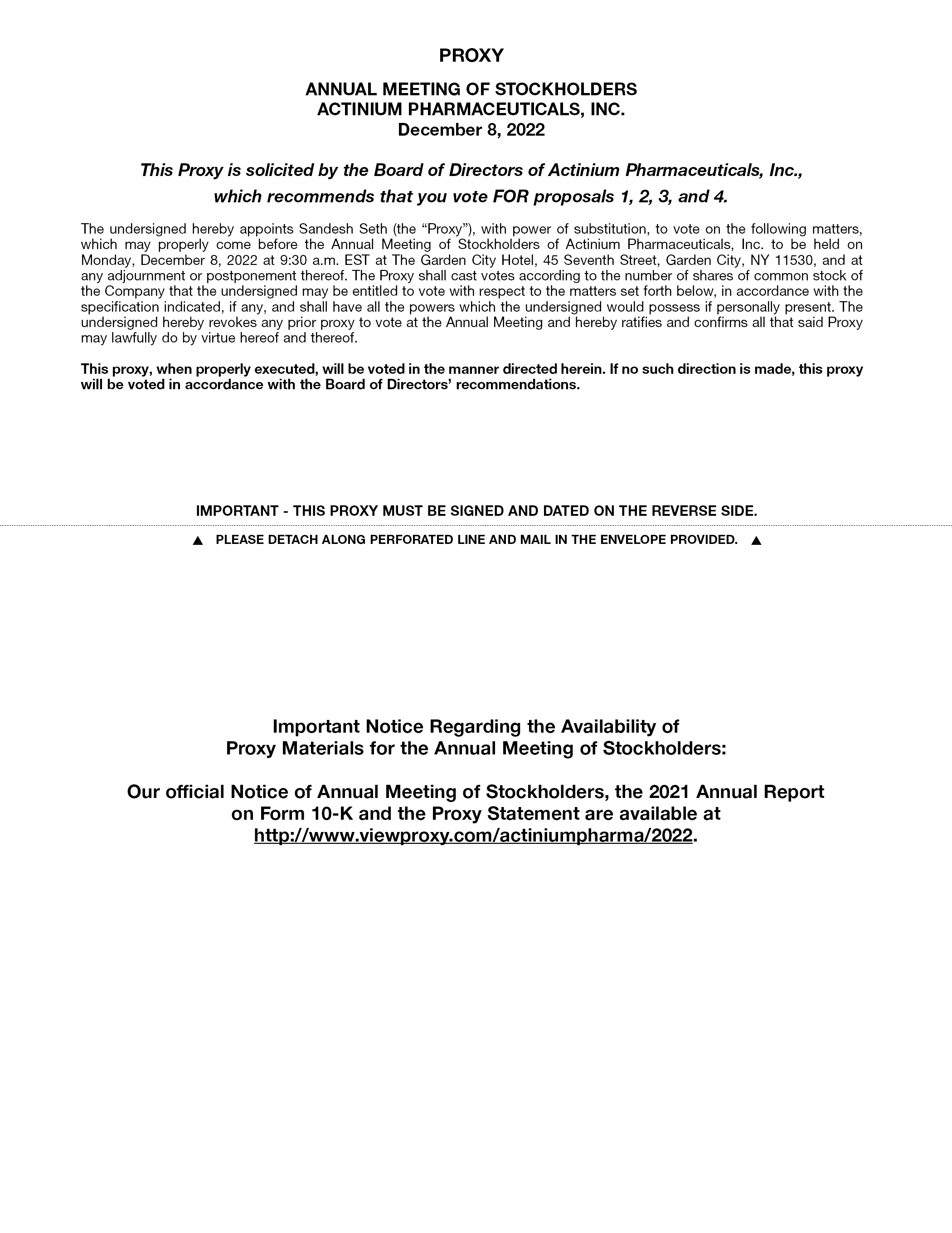 PROXY ANNUAL MEETING OF STOCKHOLDERS ACTINIUM PHARMACEUTICALS, INC. December 8, 2022 This Proxy is solicited by the Board of Directors of Actinium Pharmaceuticals, Inc., which recommends that you vote FOR proposals 1, 2, 3, and 4. The undersigned hereby appoints Sandesh Seth (the “Proxy”), with power of substitution, to vote on the following matters, which may properly come before the Annual Meeting of Stockholders of Actinium Pharmaceuticals, Inc. to be held on Monday, December 8, 2022 at 9:30 a.m. EST at The Garden City Hotel, 45 Seventh Street, Garden City, NY 11530, and at any adjournment or postponement thereof. The Proxy shall cast votes according to the number of shares of common stock of the Company that the undersigned may be entitled to vote with respect to the matters set forth below, in accordance with the specification indicated, if any, and shall have all the powers which the undersigned would possess if personally present. The undersigned hereby revokes any prior proxy to vote at the Annual Meeting and hereby ratifies and confirms all that said Proxy may lawfully do by virtue hereof and thereof. This proxy, when properly executed, will be voted in the manner directed herein. If no such direction is made, this proxy will be voted in accordance with the Board of Directors’ recommendations. IMPORTANT - THIS PROXY MUST BE SIGNED AND DATED ON THE REVERSE SIDE. PLEASE DETACH ALONG PERFORATED LINE AND MAIL IN THE ENVELOPE PROVIDED. Important Notice Regarding the Availability of Proxy Materials for the Annual Meeting of Stockholders: Our official Notice of Annual Meeting of Stockholders, the 2021 Annual Report on Form 10-K and the Proxy Statement are available at http://www.viewproxy.com/actiniumpharma/2022.