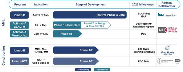 We intend to leverage the clinical data of our lead product candidates, Iomab-B and Actimab-A, to improve outcomes in patients with relapsed or refractory acute myeloid leukemia (“r/r AML”) by launching two radiotherapy drugs over the next several years to address the significant need for better outcomes from treatment with therapeutics or from undergoing a bone marrow transplant (“BMT”).