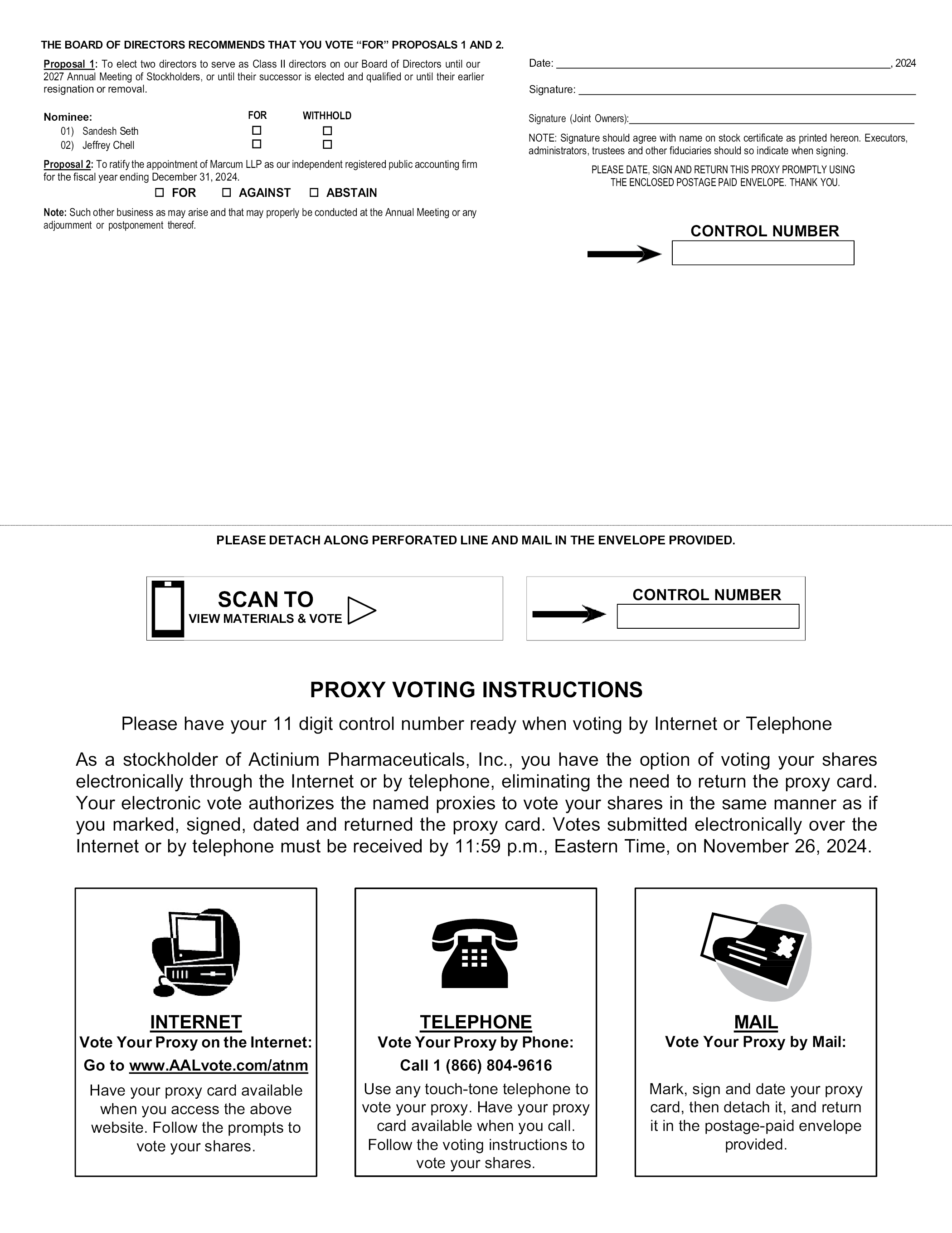THE BOARD OF DIRECTORS RECOMMENDS THAT YOU VOTE “FOR” PROPOSALS 1 AND 2. Proposal 1: To elect two directors to serve as Class II directors on our Board of Directors until our 2027 Annual Meeting of Stockholders, or until their successor is elected and qualified or until their earlier resignation or removal. Date: , 2024 Signature: Nominee: 01) Sandesh Seth 02) Jeffrey Chell FOR WITHHOLD Signature (Joint Owners): NOTE: Signature should agree with name on stock certificate as printed hereon. Executors, administrators, trustees and other fiduciaries should so indicate when signing. Proposal 2: To ratify the appointment of Marcum LLP as our independent registered public accounting firm for the fiscal year ending December 31, 2024. FOR AGAINST ABSTAIN Note: Such other business as may arise and that may properly be conducted at the Annual Meeting or any PLEASE DATE, SIGN AND RETURN THIS PROXY PROMPTLY USING THE ENCLOSED POSTAGE PAID ENVELOPE. THANK YOU. adjournment or postponement thereof. CONTROL NUMBER PLEASE DETACH ALONG PERFORATED LINE AND MAIL IN THE ENVELOPE PROVIDED. SCAN TO VIEW MATERIALS & VOTE CONTROL NUMBER PROXY VOTING INSTRUCTIONS Please have your 11 digit control number ready when voting by Internet or Telephone As a stockholder of Actinium Pharmaceuticals, Inc., you have the option of voting your shares electronically through the Internet or by telephone, eliminating the need to return the proxy card. Your electronic vote authorizes the named proxies to vote your shares in the same manner as if you marked, signed, dated and returned the proxy card. Votes submitted electronically over the Internet or by telephone must be received by 11:59 p.m., Eastern Time, on November 26, 2024. INTERNET Vote Your Proxy on the Internet: Go to www.AALvote.com/atnm Have your proxy card available when you access the above website. Follow the prompts to vote your shares. TELEPHONE Vote Your Proxy by Phone: Call 1 (866) 804-9616 Use any touch-tone telephone to vote your proxy. Have your proxy card available when you call. Follow the voting instructions to vote your shares. MAIL Vote Your Proxy by Mail: Mark, sign and date your proxy card, then detach it, and return it in the postage-paid envelope provided.