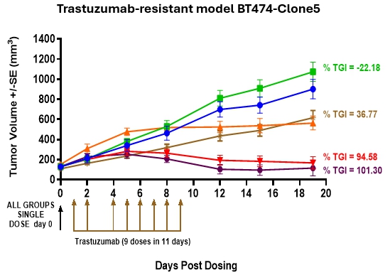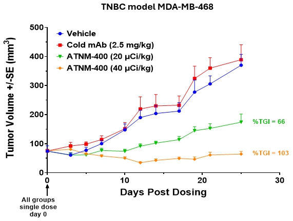 In breast cancer, we have demonstrated efficacy across HR-positive, triple-negative breast cancer (TNBC), and HER2-resistant models, with complete tumor eradication observed for ATNM-400 in combination with trastuzumab (Herceptin®) in trastuzumab-resistant models. The ATNM-400 target shows increased expression in trastuzumab-resistant tumors, providing mechanistic support for clinical development in this setting. We believe ATNM-400 represents a differentiated approach that can avoid the off-target toxicities such as interstitial lung disease observed with HER2 and TROP-2 antibody-drug conjugates such as Ehertu® and Datroway®, respectively.