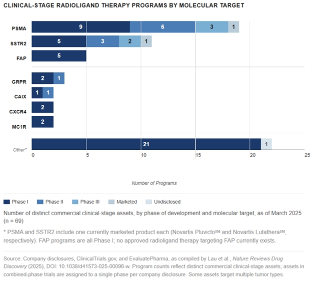 Many companies have entered the space, perhaps attracted by the success of the aforementioned products and also the acquisitions of several companies in recent years. However, most companies have focused on just a handful of targets. Consequently, we believe the radiopharmaceutical field remains in its early stages despite the number of companies now developing radiotherapies. This is apparent as a majority of the radiotherapy industry development pipeline is clustered around a handful of biological targets with most companies focused on prostate-specific membrane antigen (PSMA), somatostatin receptor type 2 (SSTR2) antagonists/agonists and variations on the theme (NSTR2, NSTR3, etc), and fibroblast activation protein (FAP). Each of these targets features multiple programs using different targeting moieties including but not limited to peptides, small molecules, antibodies as well as various isotope payloads including beta emitters like Lutetium-177 and alpha emitters such as Actinium-225 and Lead-212.