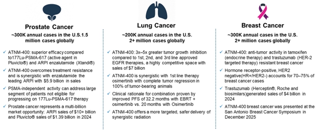 Our pipeline features multiple first-in-class programs targeting novel antigens not currently addressed by existing radiopharmaceutical platforms. ATNM-400 represents a differentiated approach in prostate cancer by targeting a non-PSMA antigen, potentially addressing patients who do not respond to or progress after PSMA-targeted therapy such as Pluvicto®, as well as enabling earlier line combinations with androgen receptor pathway inhibitors (ARPIs). With demonstrated pre-clinical efficacy across prostate cancer, NSCLC, and breast cancer, ATNM-400 has pan-tumor potential addressing a combined patient population exceeding 800,000 in the United States. Our pre-clinical data demonstrate that ATNM-400 outperformed leading approved therapies by 3-5 fold in EGFR-mutant NSCLC models as a monotherapy in terms of tumor growth inhibition, produced cures in combination with Tagrisso®, and achieved complete tumor regression in combination with Herceptin® in HER2-resistant breast cancer models.